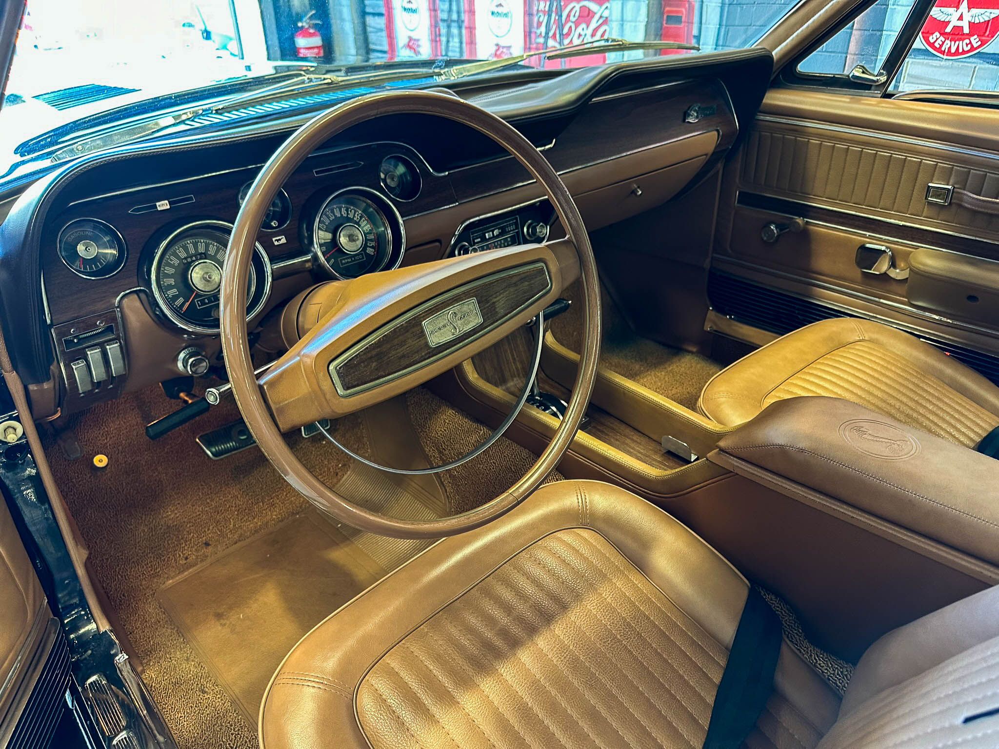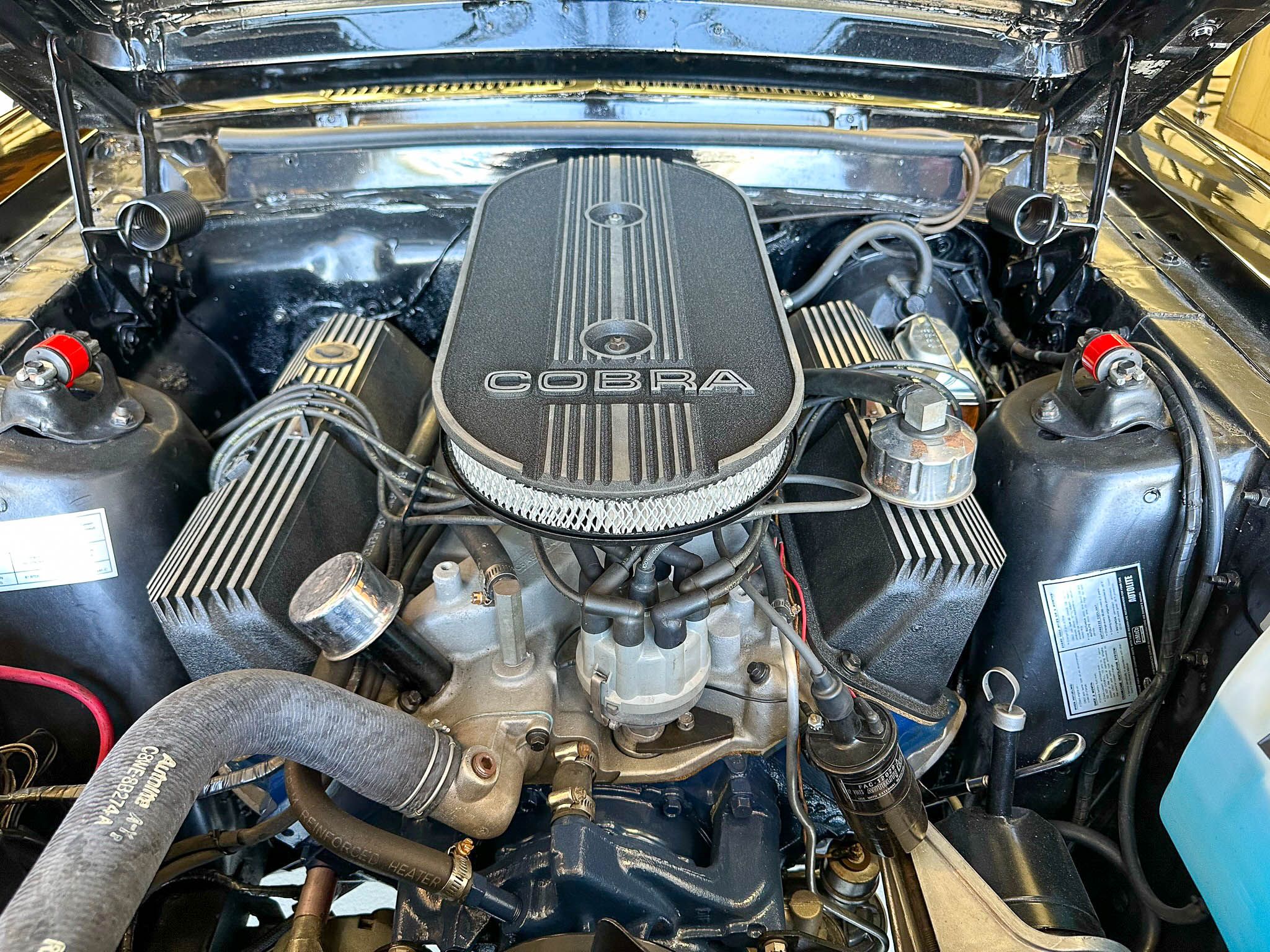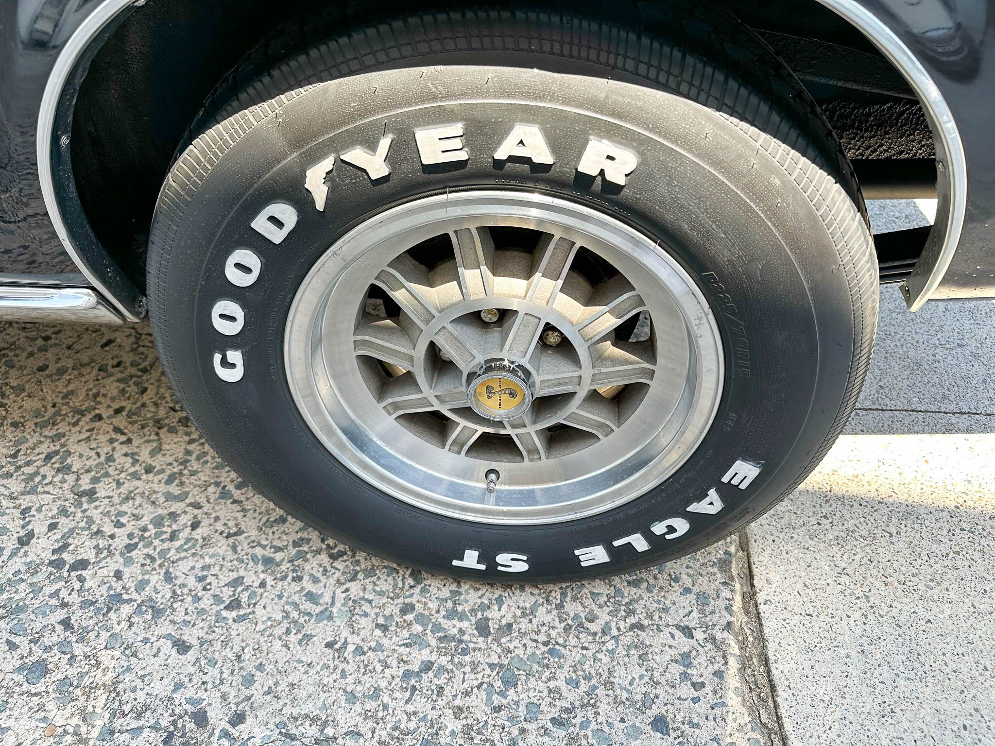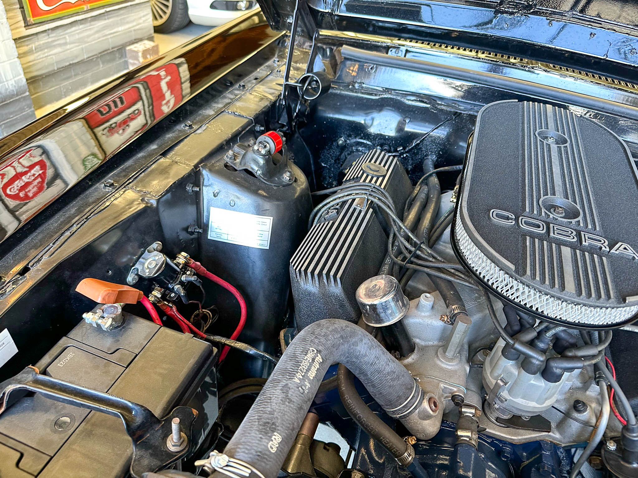 Equipped with the GT500’s upgraded suspension with an anti-roll bar, front coil springs and rear leaf springs. Inside, the Interior Décor Group package sees a black vinyl accented handsomely with woodgrain trim. You can also expect bucket seats, a woodgrain steering wheel with a Shelby centerpiece and vintage gauges. Under the hood lies Ford’s Cobra Jet V-8 mated to a 3-speed automatic transmission.