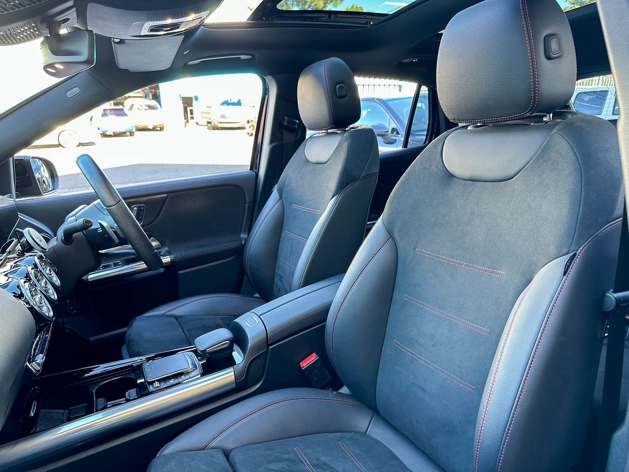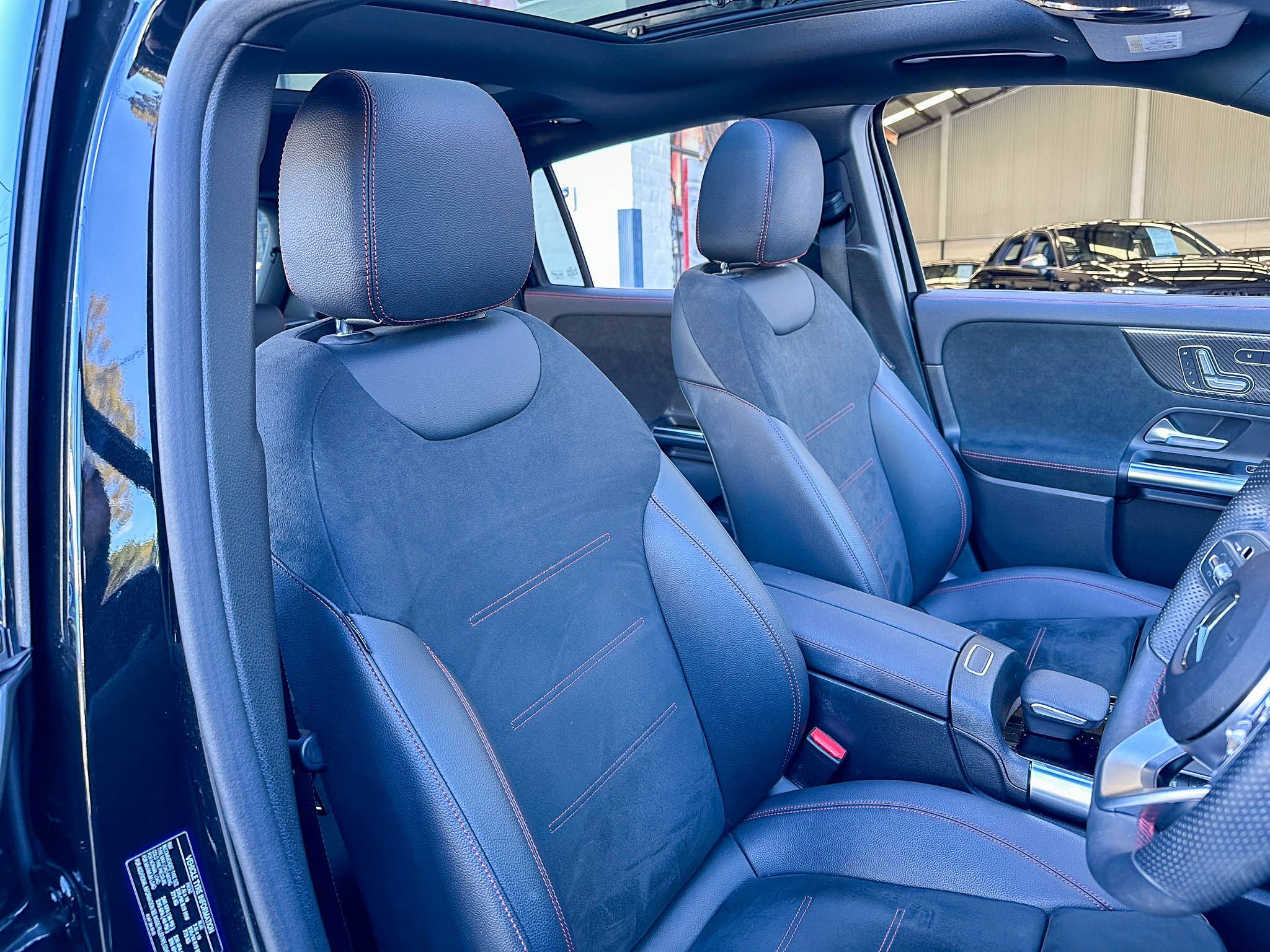 – red stitching surrounding seats and doors